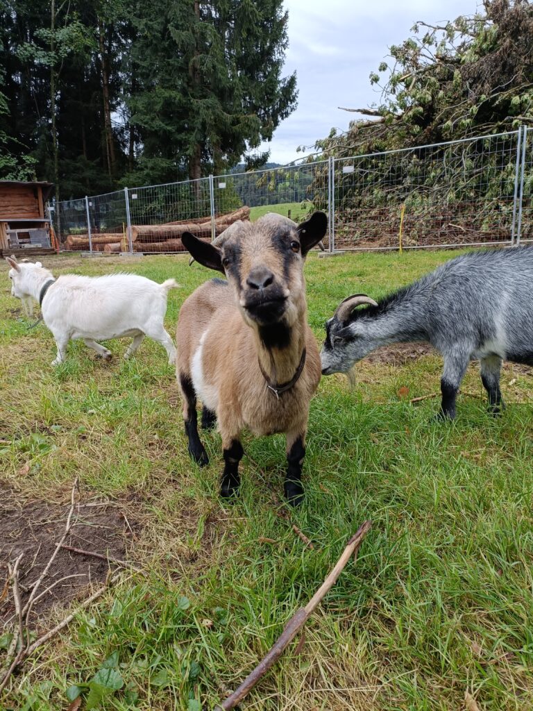 Die Ziegen und Schweine und künftig die Pferde leben gemeinsam zusammen mit den Katzen im Stall ebenfalls in einer Gemeinschaft. Die Ziegen und Schweine sind sich ebenfalls an die Hunde gewöhnt und akzeptieren sich gegenseitig.